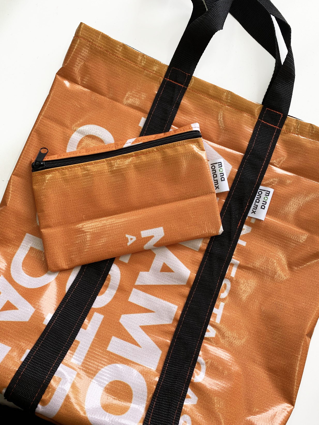 Productos sostenibles hechos de lona publicitaria reciclada.